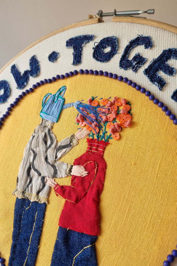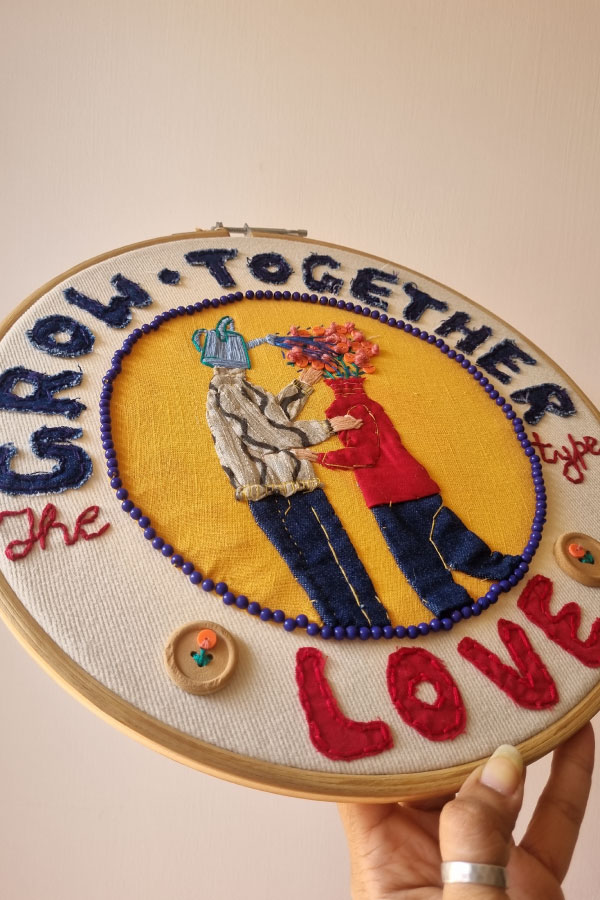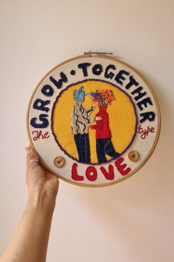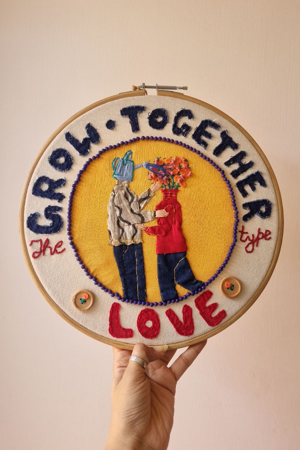 - Around the bloom, bold lettering proclaims: “GROW TOGETHER type LOVE”—a mantra of mutual growth embroidered in vibrant threads.