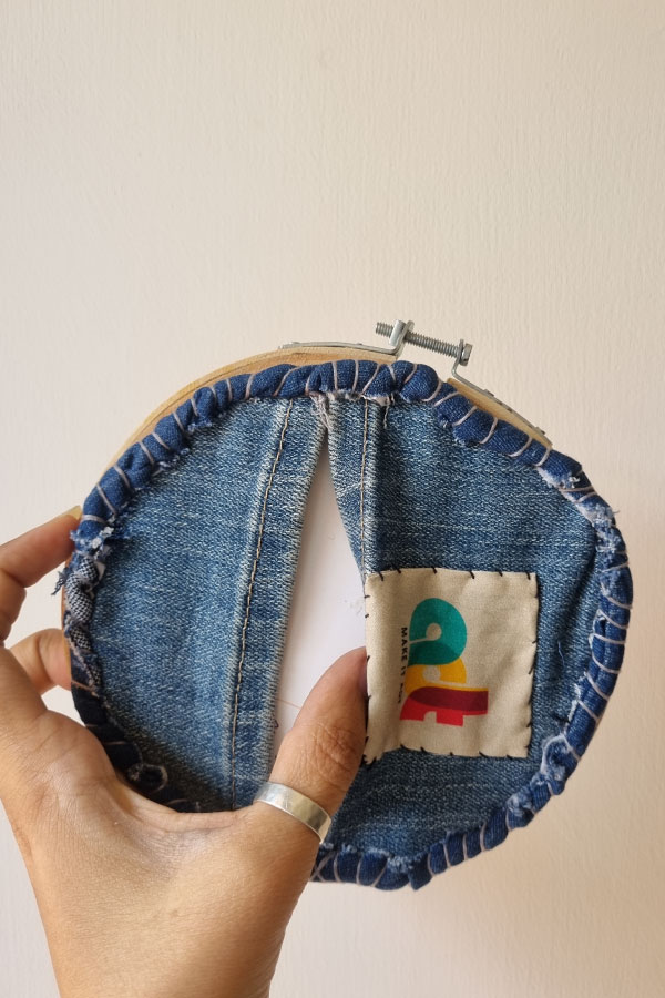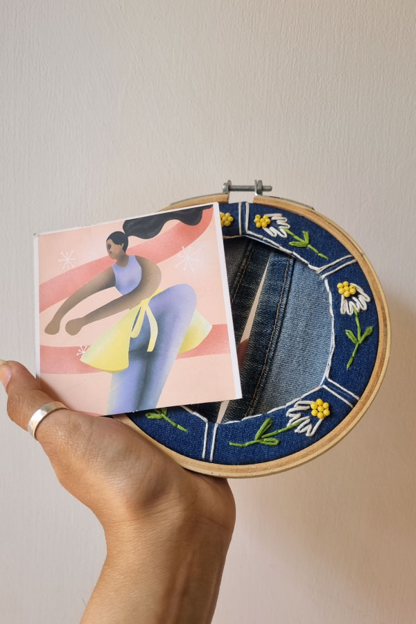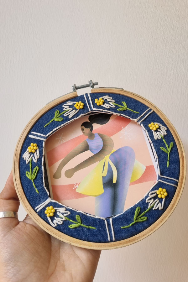- Denim‑blue fabric stretched within a circular hoop, embroidered with delicate white blossoms, golden centers, and green stems.
