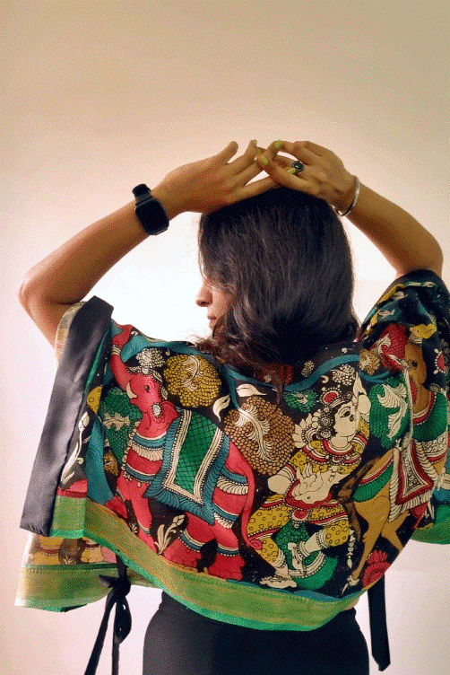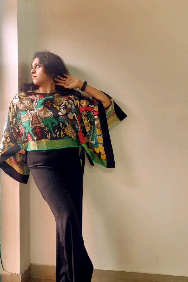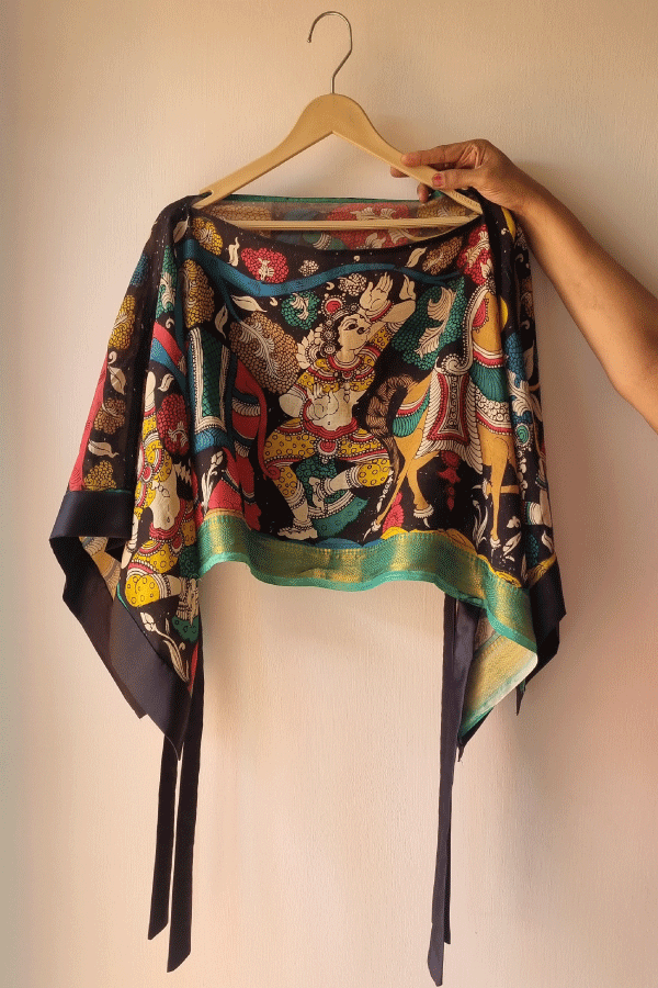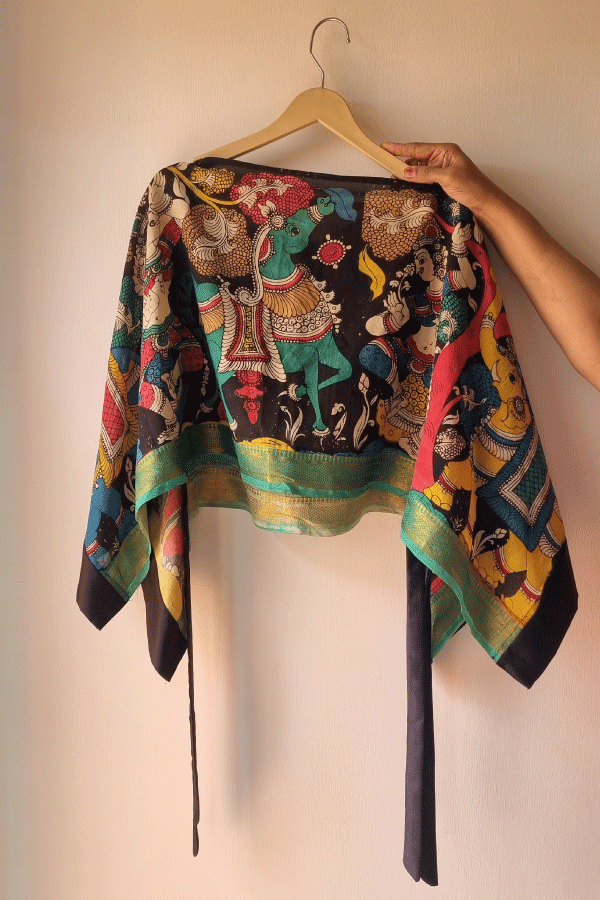 Kalamkari free size top , handcrafted with love by Make It ADT and painted by Kooky Nari, is a wearable piece of heritage. Using the ancient pen Kalamkari technique, artisans sketch motifs with a hand-held bamboo pen and natural dyes, following a meticulous 23-step process of washing, treating, and layering colors. Each design—peacocks for grace, florals for growth, and expressive faces echoing myth and folklore—emerges slowly through sun-drying, mordanting, and dye fixing, making every clothing unique. Rooted in tradition yet styled for today, it carries the soulful storytelling of Kalamkari art, blending cultural symbolism with contemporary comfort.