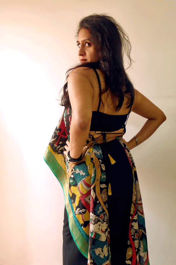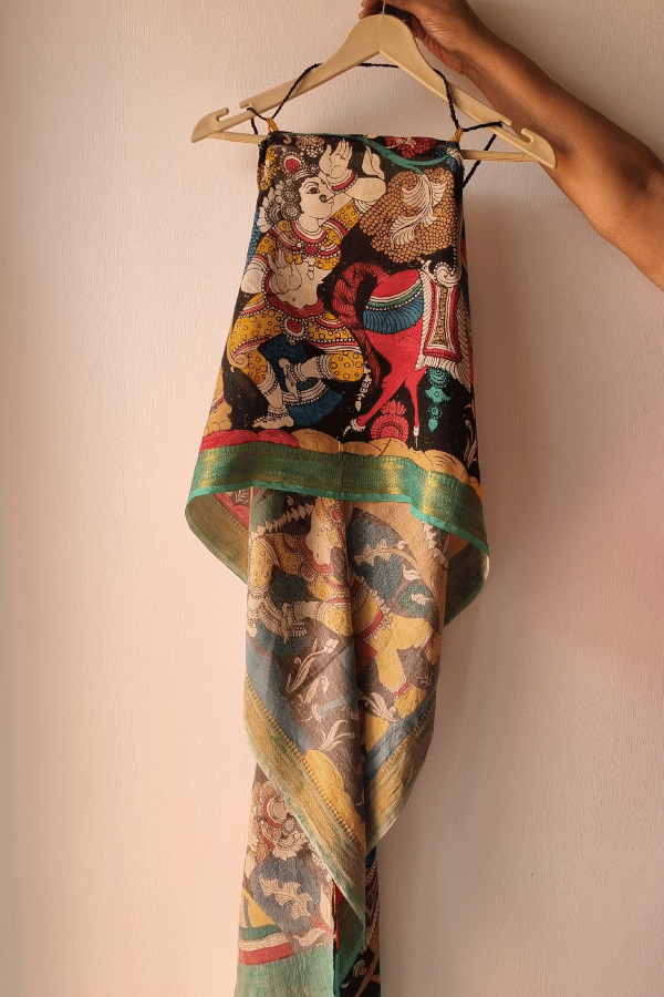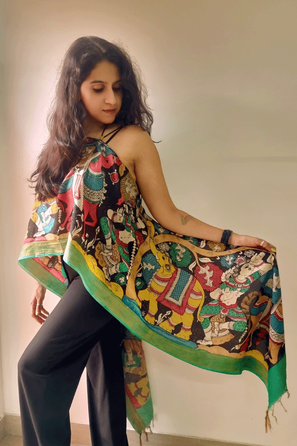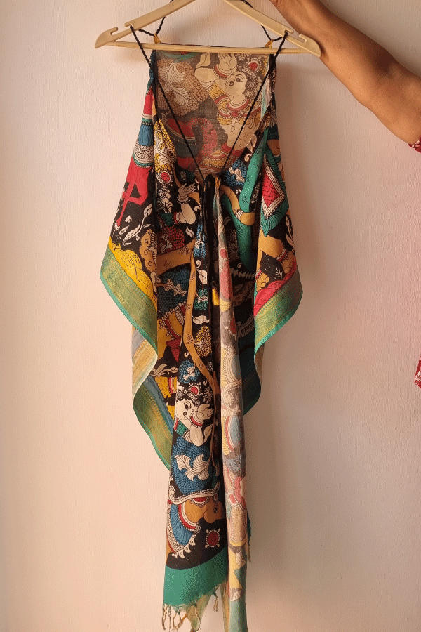 Kalamkari free size top , handcrafted with love by Make It ADT and painted by Kooky Nari, is a wearable piece of heritage. Using the ancient pen Kalamkari technique, artisans sketch motifs with a hand-held bamboo pen and natural dyes, following a meticulous 23-step process of washing, treating, and layering colors. Each design—peacocks for grace, florals for growth, and expressive faces echoing myth and folklore—emerges slowly through sun-drying, mordanting, and dye fixing, making every clothing unique. Rooted in tradition yet styled for today, it carries the soulful storytelling of Kalamkari art, blending cultural symbolism with contemporary comfort.